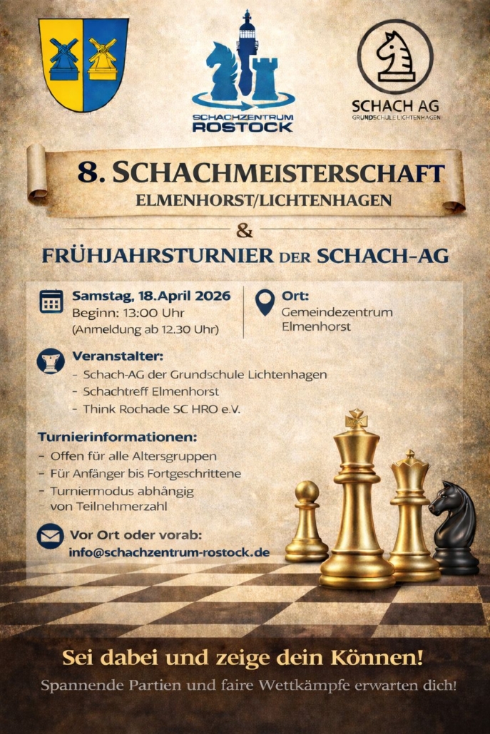 18.04. – 8. SCHACHMEISTERSCHAFT Elmenhorst / Lichtenhagen 7. April 2026/in Allgemein /von Admin2 Frühjahrsturnier und Gemeindemeisterschaft Elmenhorst 2026 (.pdf) https://www.elmenhorst-lichtenhagen.de/wp-content/uploads/8-Schachmeisterschaft-Elmenhorst_Lichtenhagen.jpg 1536 1024 Admin2 https://www.elmenhorst-lichtenhagen.de/wp-content/uploads/elmenhort-lichtenhagen-wappen.jpg Admin22026-04-07 11:03:542026-04-07 11:03:5418.04. – 8. SCHACHMEISTERSCHAFT Elmenhorst / Lichtenhagen