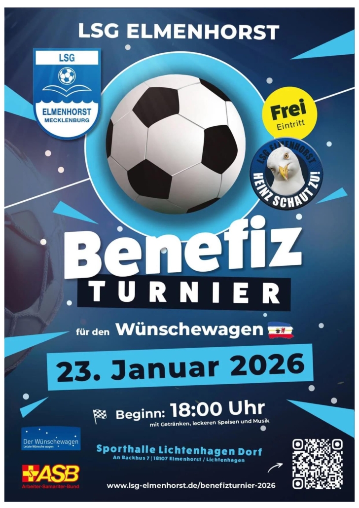 Am 23.01.2026 ab 18:00 Uhr richtet die LSG Elmenhorst ein Benefiz-Fußballturnier zugunsten des Wünschewagens Mecklenburg – Vorpommern aus.