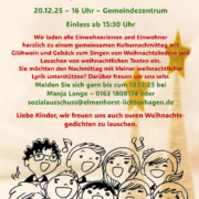 Bei Livemusik und Liedtexten zum Mitsingen wollen wir uns gemeinsam auf die bevorstehenden Weihnachtstage einstimmen. Wer möchte, ist herzlich aufgerufen, eine kurze Weihnachtslyrik zu präsentieren. Wir freuen uns auch über Gedichte unserer Jüngsten.