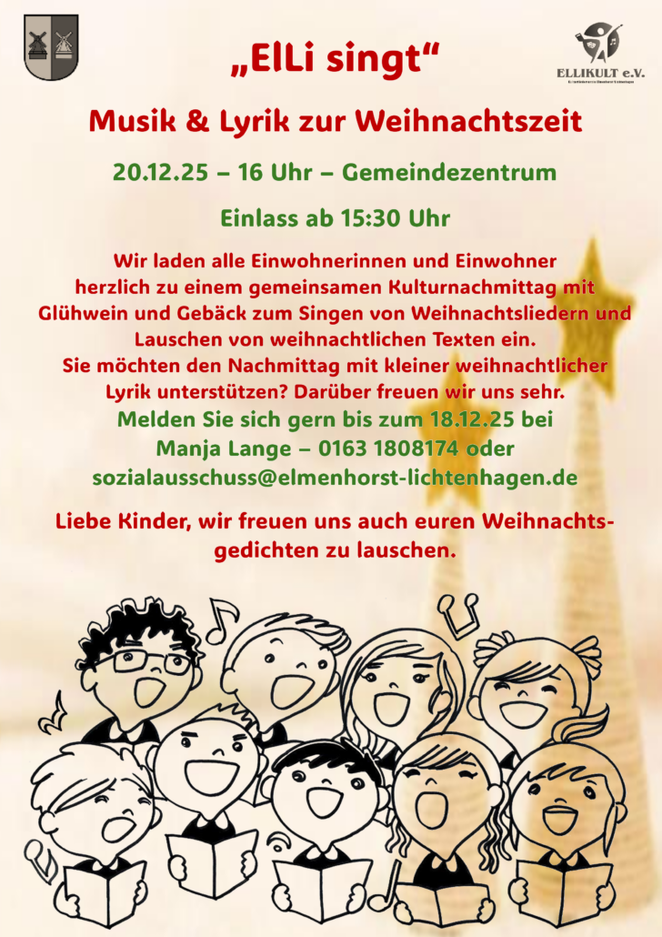 Ab 15.30 Uhr öffnen sich die Türen vom großen Saal. Unser Kulturförderverein Ellikult e.V. begrüßt Euch und Sie bei Glühwein und Gebäck.