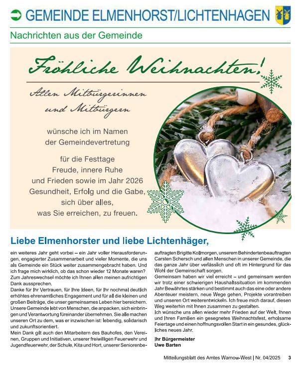 Ich wünsche Ihnen auch im Namen des gesamten Behindertenbeirates der Gemeinde eine friedvolle Weihnacht und einen guten Start in das Jahr 2026.