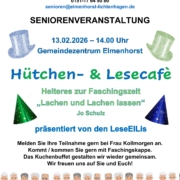 Zu einem heiteren Nachmittag, wenn gewollt mit Faschingshütchen, aber garantiert heiteren Geschichten lädt unsere Seniorenbeauftragte Brigitte Kollmorgen am Freitag, dem Dreizehnten, alle Seniorinnen und Senioren zu 14 Uhr herzliche in das Gemeindezentrum ein. Unterstützt wird die Veranstaltung von Bärbel von den LeseElLis.