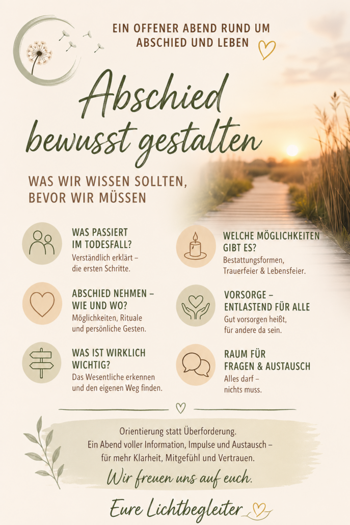 Abschied bewusst und individuell zu gestalten. Ein offener Raum für Gedanken, Fragen und Austausch.